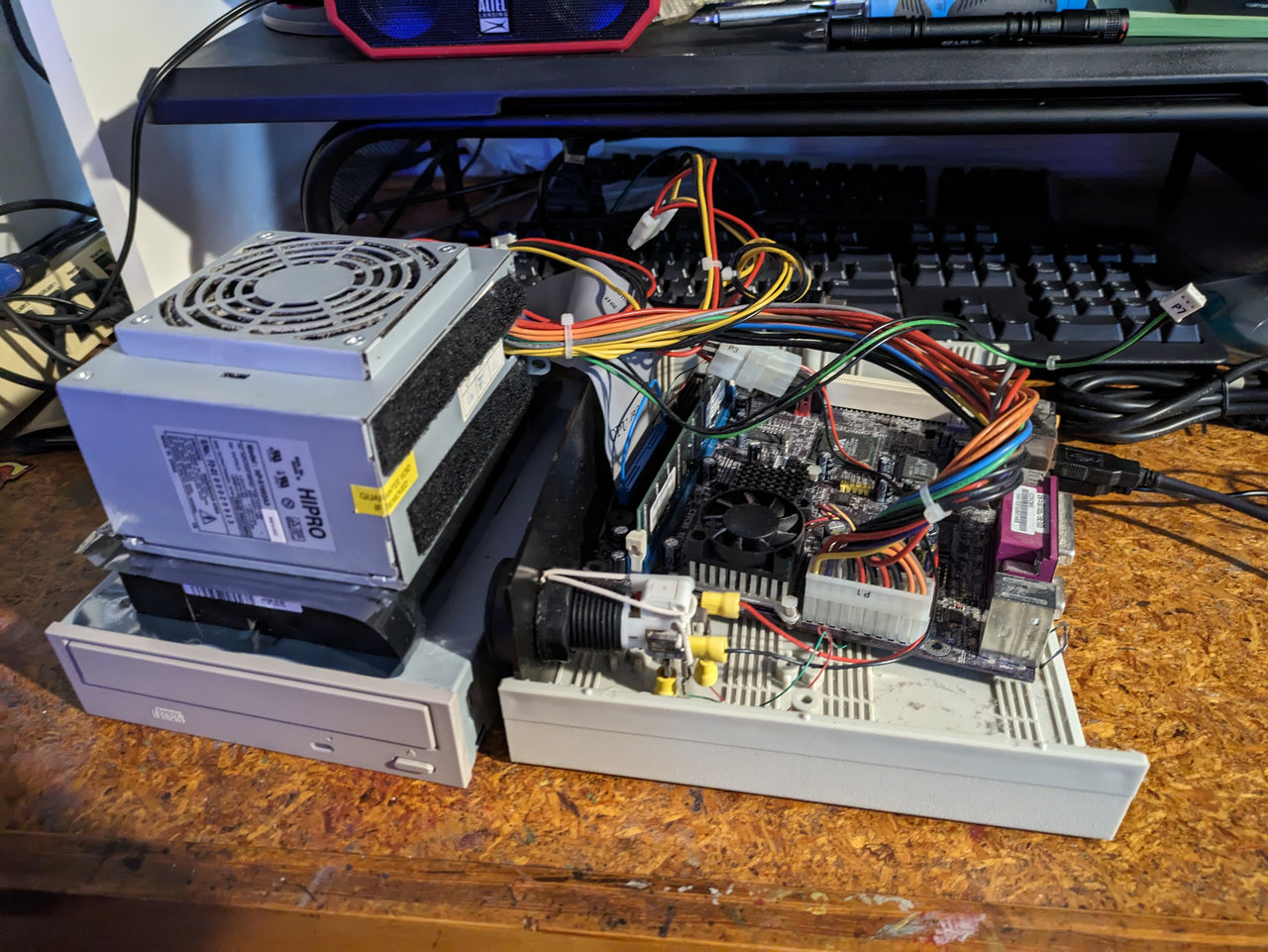 A presently-unfinished Mini-ITX build; technically is fully functional, but still needs some work to finish its case. This is going to take materials and tools that I don't presently have access to. A more detailed explanation of Ferretcage's history and purpose can be found at this Blaugh post of mine.