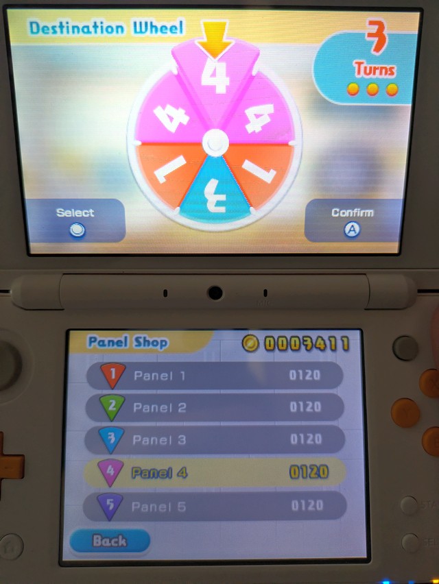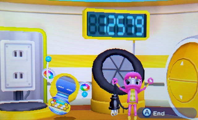 All this sounds like small potatoes; it really is at least a functional game, if not a particularly imaginative one anymore, if not for the real kicker that is the stage select spinner. Upon finishing a stage, you are shown the Destination Wheel, a Wheel of Fortune-esque spinner divided into six numbered panels. Your next stage is determined by which number the wheel lands on. There are ways to rig this spinner; hitting the gold or silver UFO at the end of the stage gives you opportunities to spin the wheel again if you don’t like the result, or you can spend coins (not Moolah anymore) to buy new panels to place on the wheel wherever you like. You are likely to be sitting on a huge pile of coins by the time it becomes necessary to rig the wheel, unless you lean on the assist items a lot (the only other thing coins can be spent on), but if you can’t re-spin, and didn’t think to buy new panels, it’s possible to land on a stage you’ve already completed. And when that happens, you have to play that stage again, no matter what.