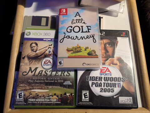 Dad also was willing to lend me a lift to the somewhat-distant game shop, where I've had tons of store credit burning a hole in my wallet. Encouraged to spend as much of it as possible, I picked up Tiger Woods PGA Tour 2005 for PlayStation 2, Tiger Woods PGA Tour 14 Masters Historic Edition for XBox 360, and the Limited Run Games release of Okidokico's excellent A Little Golf Journey - a game that I already owned digitally via Steam, but am quite happy to have physically represented in the Shrine proper, even if I don't plan on playing it in this form. (After all, it only really cost me 3 or 4 PS2 games that I didn't want anymore.)